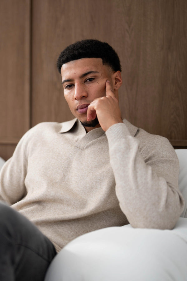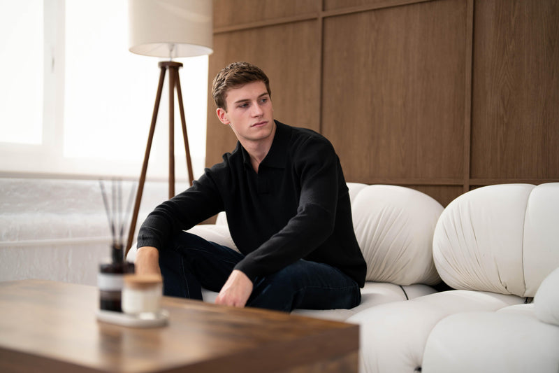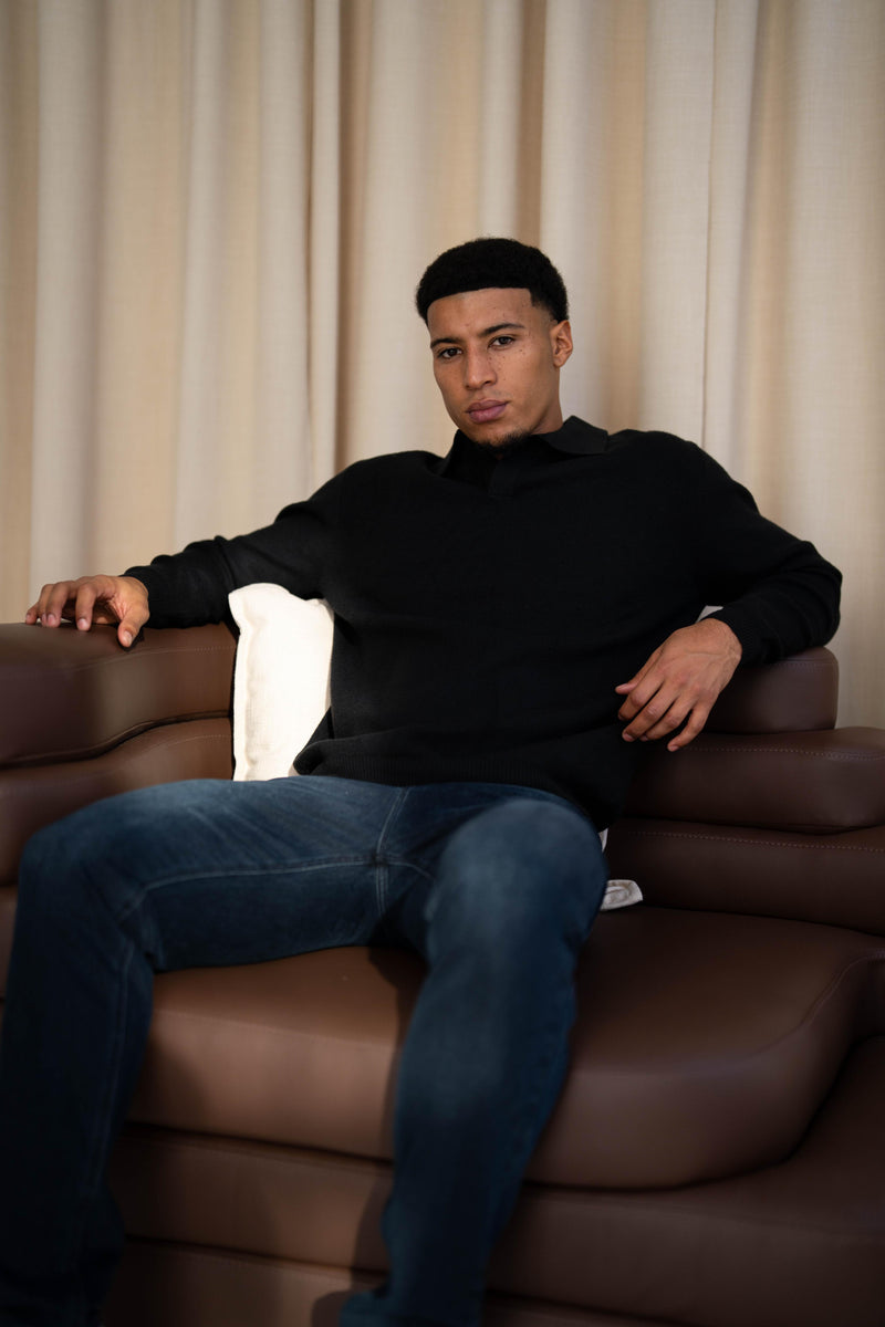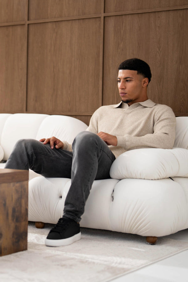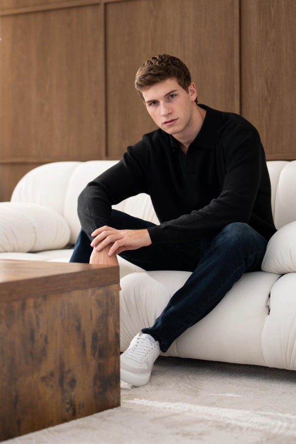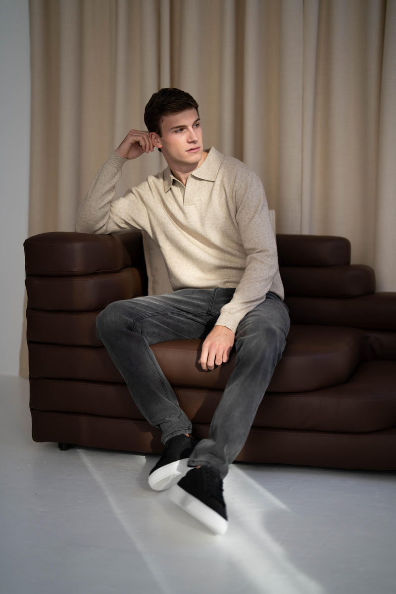 Both models are wearing our Ultra Fine Knit Polo with our Atelier Jeans in Grey Wash and Dark Blue. These polos are available in Stone and Black.
