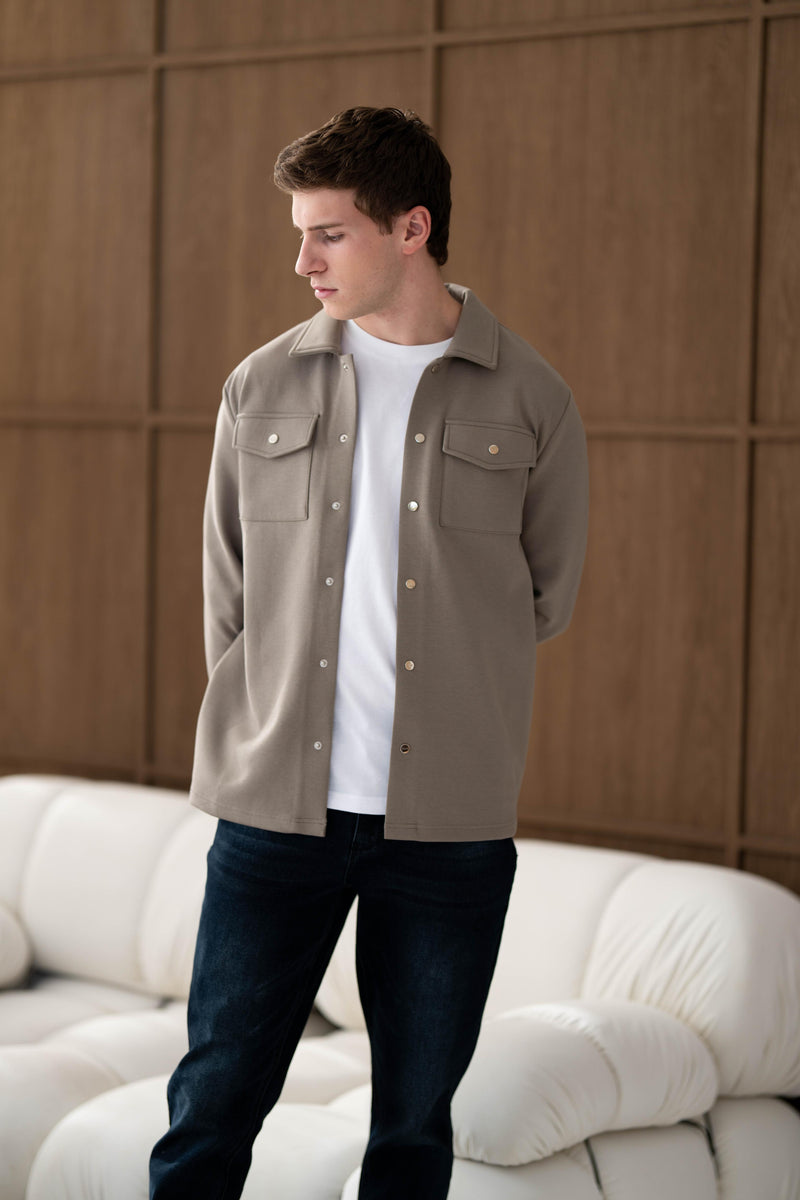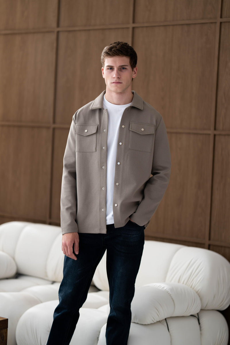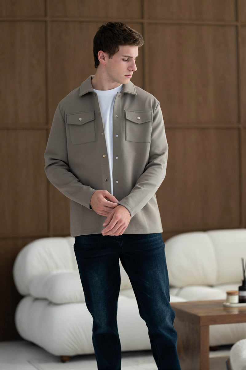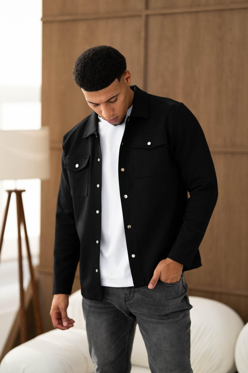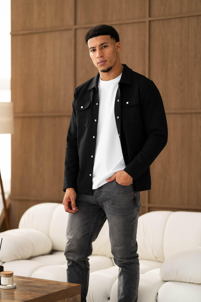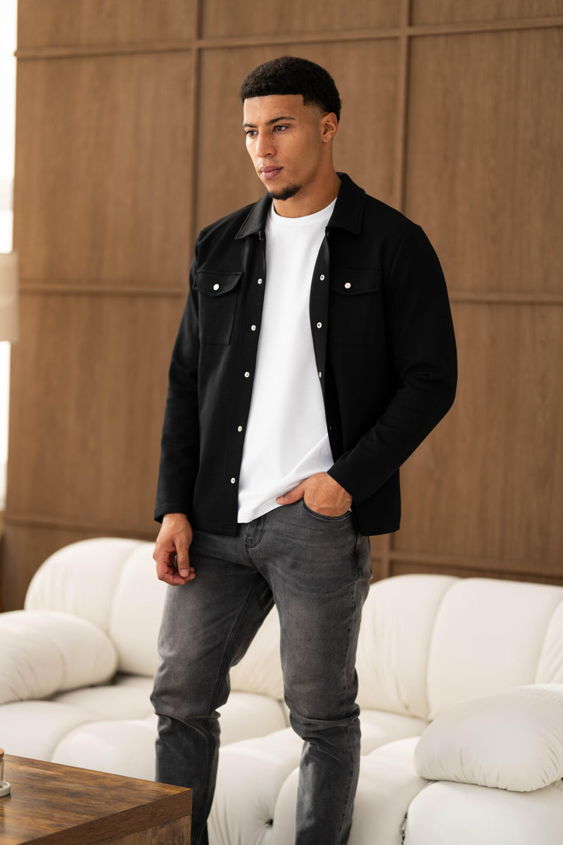 Here both models are wearing our Luxury Overshirt and Atelier Jeans in Grey Wash and Dark Blue. Both Overshirts are available in Olive and Black.