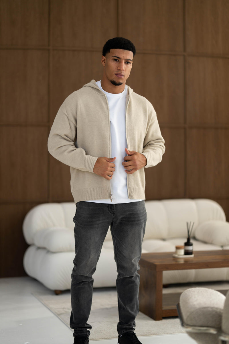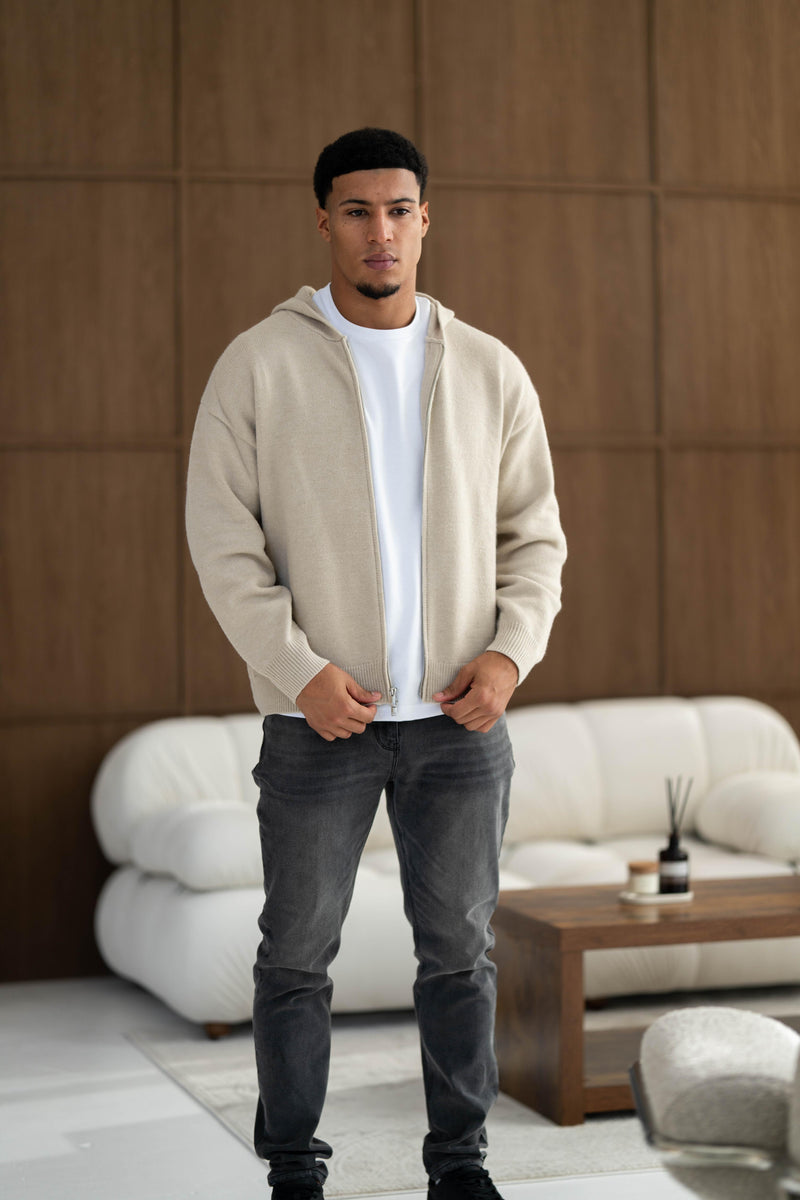 Our Luxury Zip Knit Hoodie here is styled with our Atelier Jeans in Grey Wash. This hoodie is a subtle piece for all occasions.
