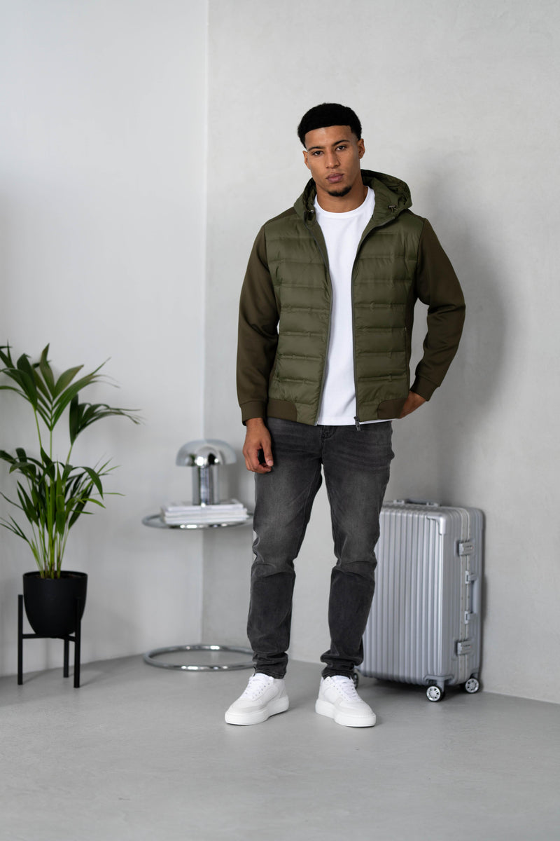 Here our Hybrid Jacket is being styled alongside our Atelier Grey Wash and Dark Blue Jeans, and Atelier White T-shirt.